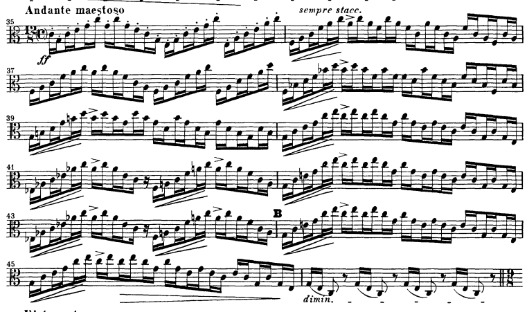 あとスタッカートなんで全部飛ばし気味にやらなきゃいけなくて、これがまた音が汚くなる要因だったりするんですよねー。ただでさえ移弦ありまくりなので走ったりする可能性を秘めています。あぁ大変。