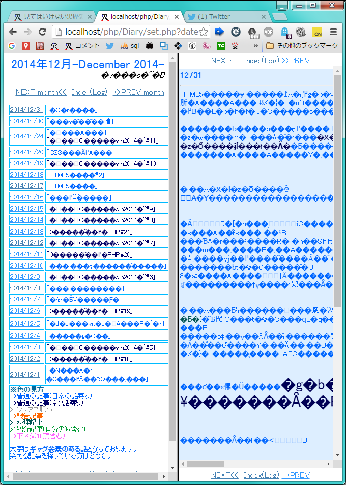 どういうことかっていうと、2013年11月を経由して、2013年12月に行くと文字化けします。共に文字コードがutf-8のはずなのに。不思議ですね。