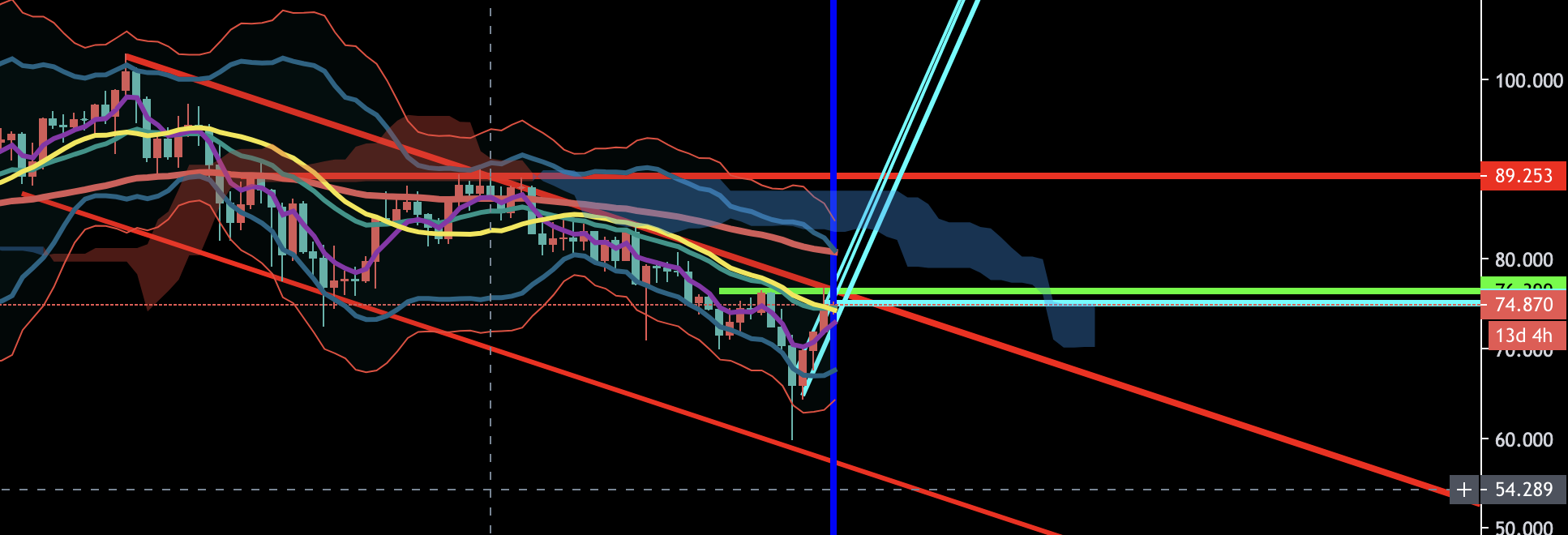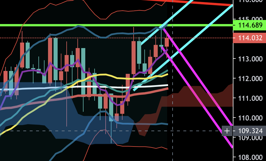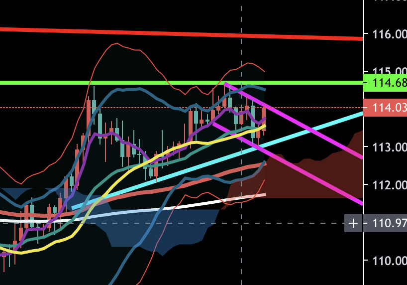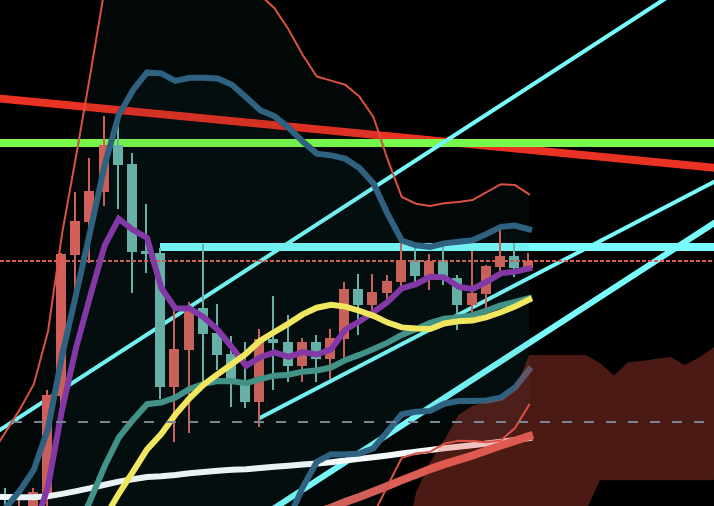 ほぼ自分向けのメモに近いので、まじで独り言のノリで話しますが、一応補足しておくと、赤が月足、黄緑が週足、水色が日足、ピンクが4時間足、青が1時間足を基準に引いたライン、そして白が200EMA、濃赤が75EMA、濃緑が20EMA、黄が20SMAですね。一応そういう色分けでチャート見てます。