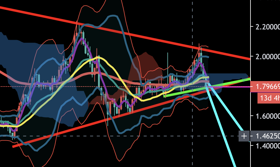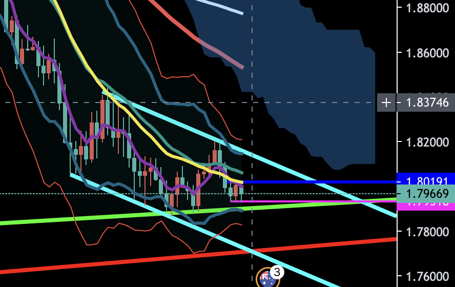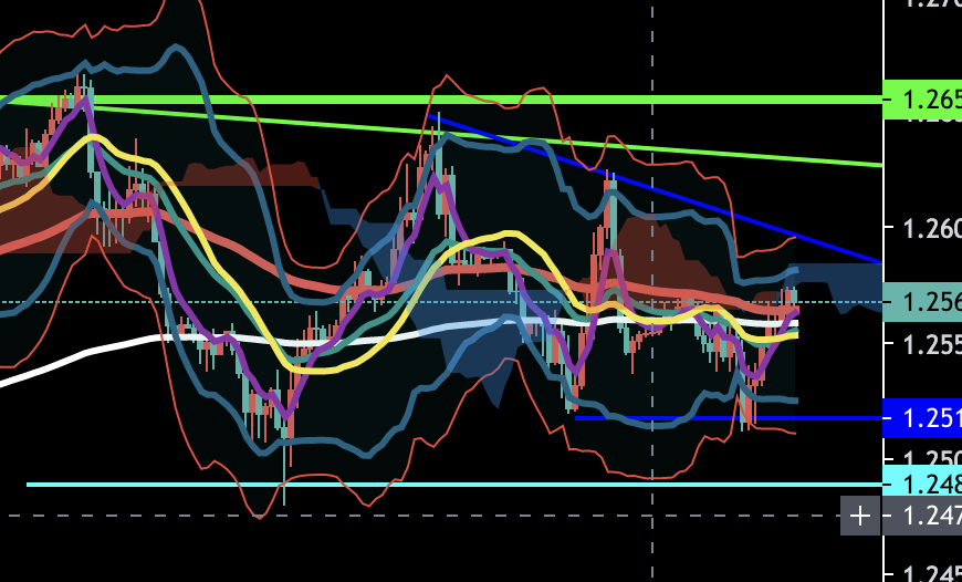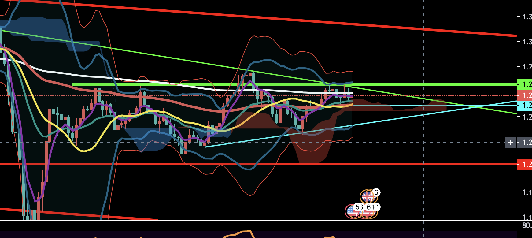 変わりましてこちらはポンドドルですね。日足で見ると、ラインだったりEMAだったりで反発している風なのを見受けられます。一応大きな時間軸でもダウントレンドっぽいので、ここで売りに入るのは賭けてもいいかな感はします。