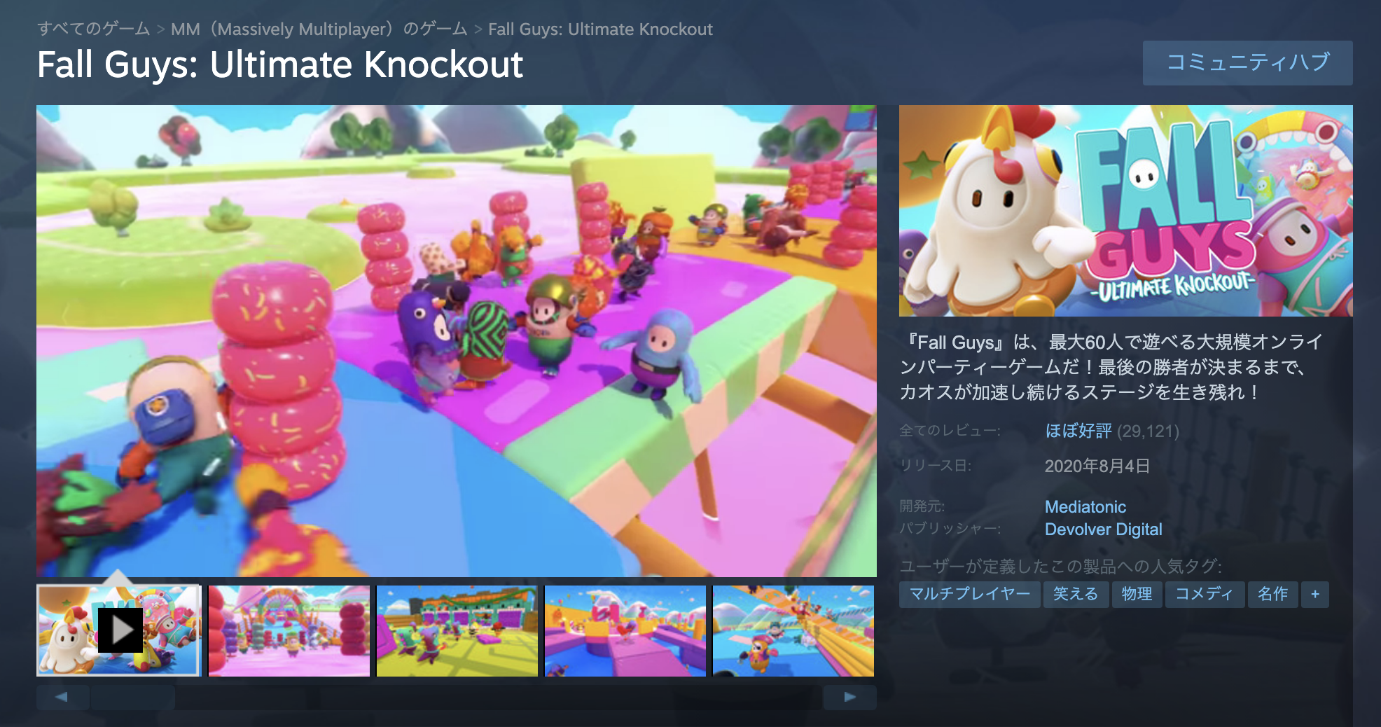 Fall Guysっていうゲームがいまアツそうなんですよね。配信されたばっかで、あと普通に見てておもしろそうです。
