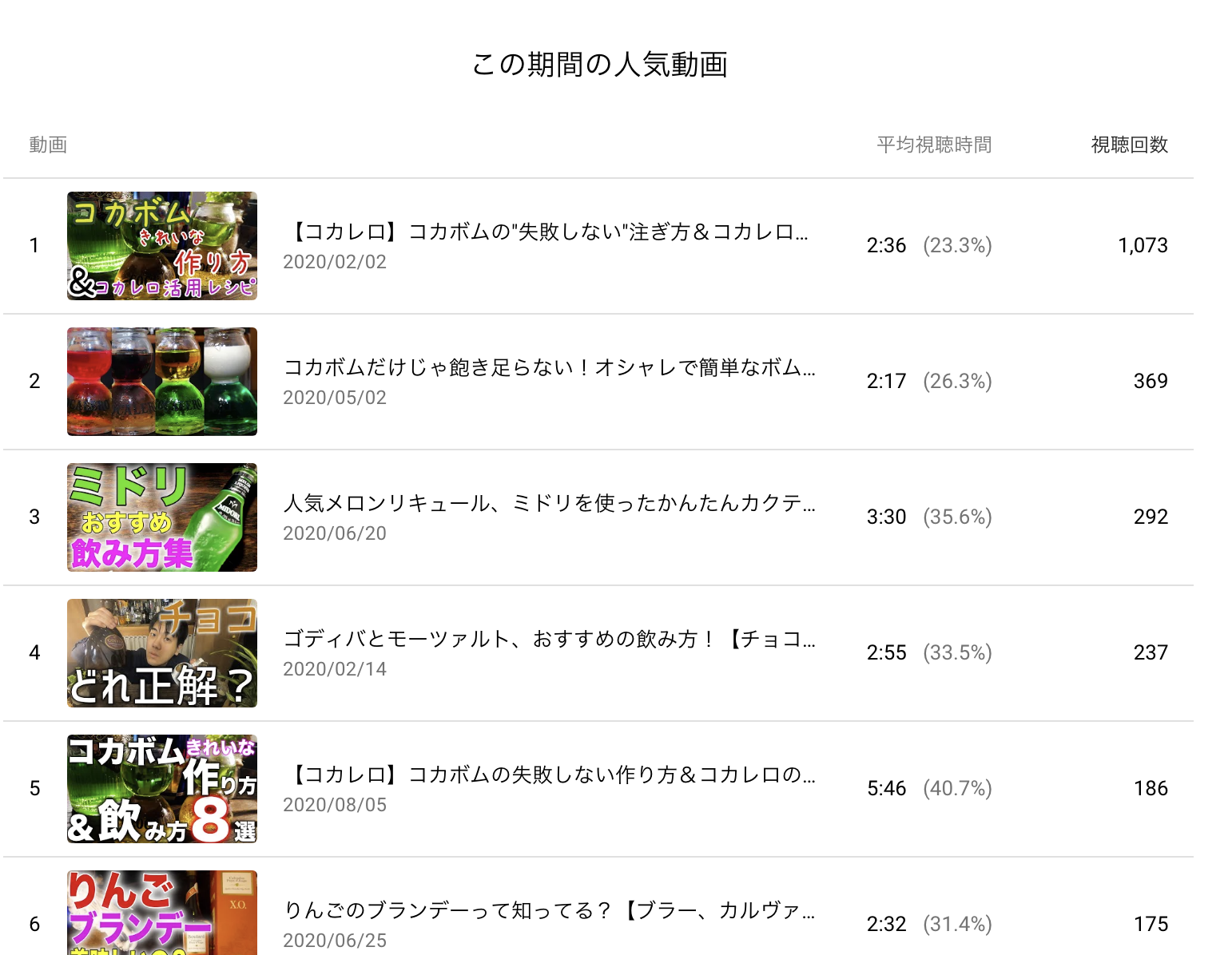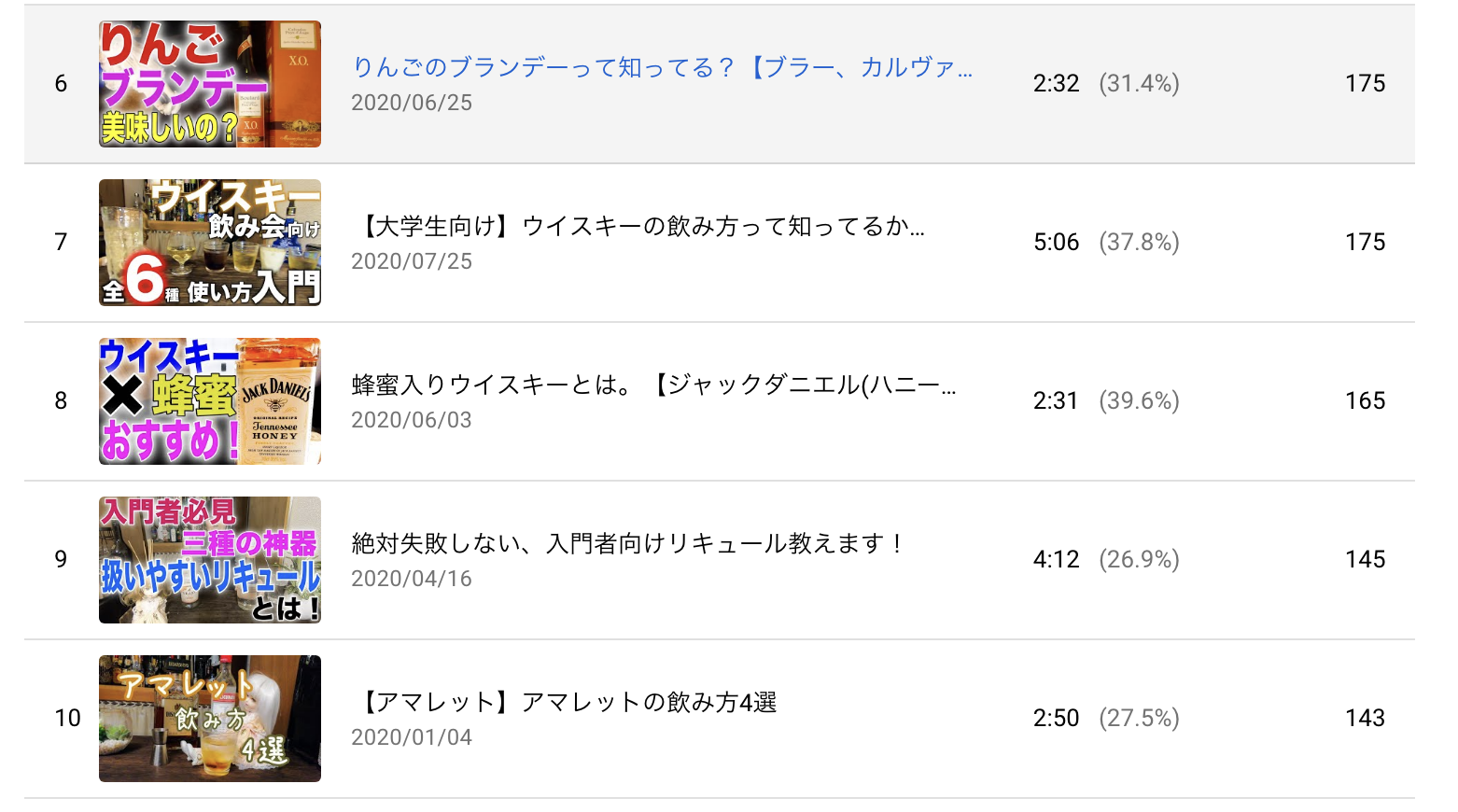 「カクテル」をメインにした動画ももちろん人気なんですよね。僕はチャンネルの方針上、あまりカクテルに主眼を置かず、リキュールの活用法として副次的にカクテルを紹介する形を取ってるんですが、やはり検索する側の気持ちを考えた場合、有名なカクテルから入る可能性の方がやっぱり高いんですよね。