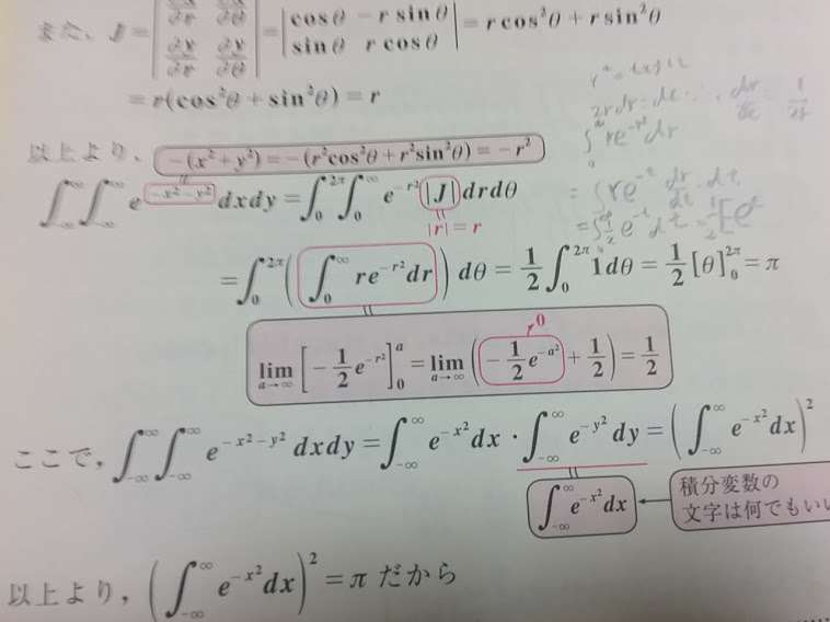 このr*e(-r^2)の定積分の答えが1/2になることをさらっと書いてあるんですが