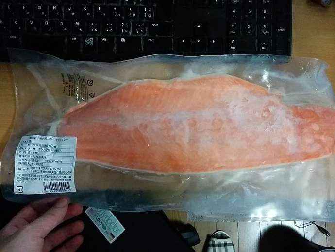 サーモンの味を思い出すために、後日業務スーパーで買い物してる時にこんなもの見つけたので買ってみました。1kgで780円のサーモンフィレーの冷凍品です。