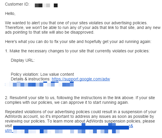 他サイトへの誘導(ブリッジページ)となってるのが悪いんじゃないかという結論になりました。