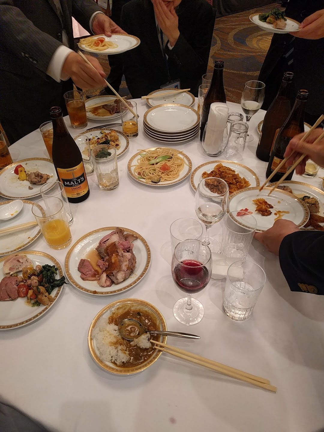 こんな感じの立食パーティーですね。肉がめちゃくちゃ美味かったし、会社の偉い人とお話したりなかなかおもしろかったですね。あと、会場もちょっと豪華な感じでよかったです。まぁ、お金はかかってるらしいですからね・・・・・・人間。