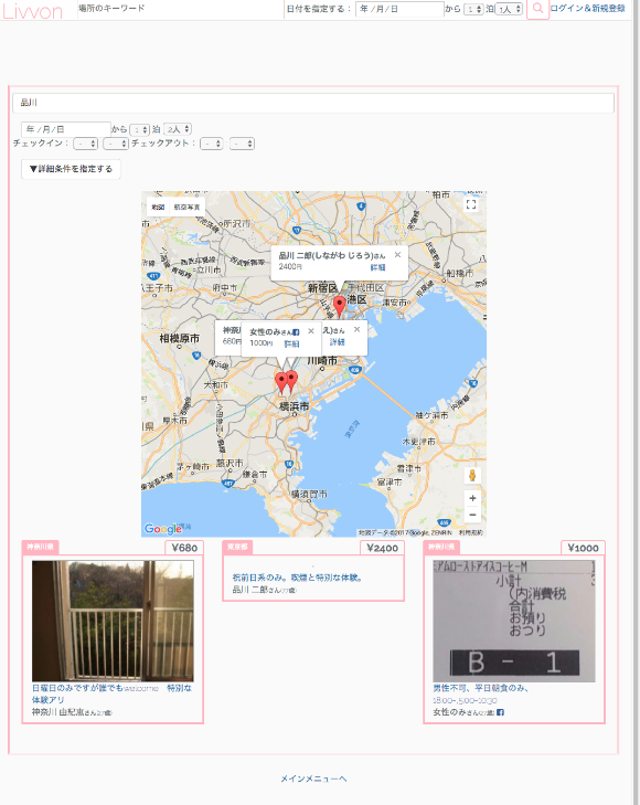 まだ見せてない画面に関して言うのもあれなんですが通常の検索画面に関しては、もともとAjaxで実装してるのでジオコーディングはなんかjavascriptでやろうとしてたんですよね。まぁ、それを作る時に「そういえば制限大丈夫なのか?」って再び疑問に思って調べたら死んだ、って感じですね。
