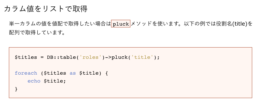 pluck()っていうものがありまして、なんかこれ、配列で取得できるみたいな言い方してると思ってたんですよね。