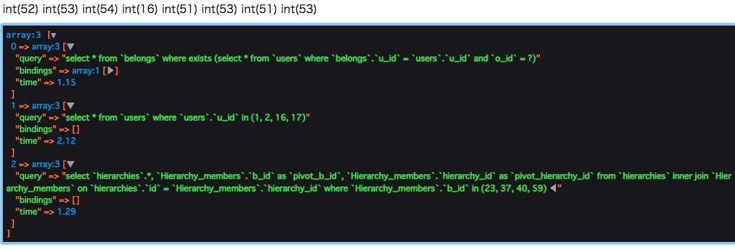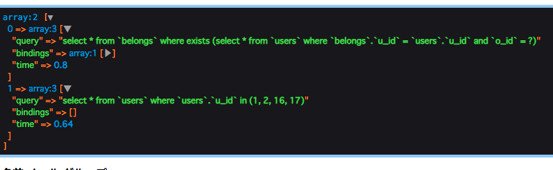 クエリログを見ると、foreach内でuserを参照していますが、n+1問題が発生してないのでめでたしめでたし、って感じですね。