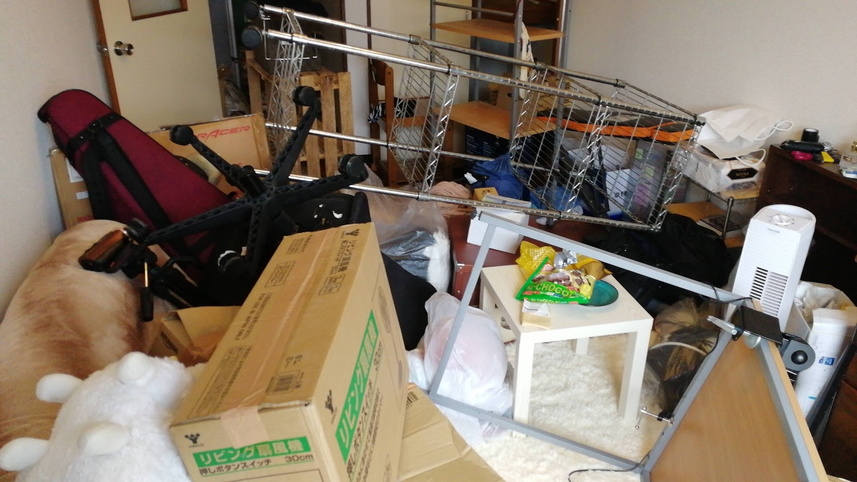 で、頑張ってお掃除したんですが、2時間ぐらいかけて終わったのは、写真中央に横転してる棚をアルコールウェットティッシュで拭いただけで終わりました。()