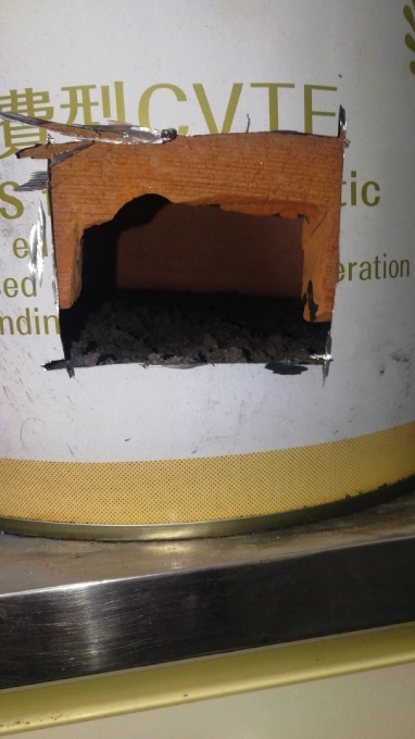 調理時は、ほんとは木炭を下から投入したかったんですが、見てわかるとおりろんぐさんがチキって空気孔兼掃除用穴を小さく切ってしまったので、ここから木炭を入れるのは厳しいので上から落としてなんとかするみたいな感じになりそうです。