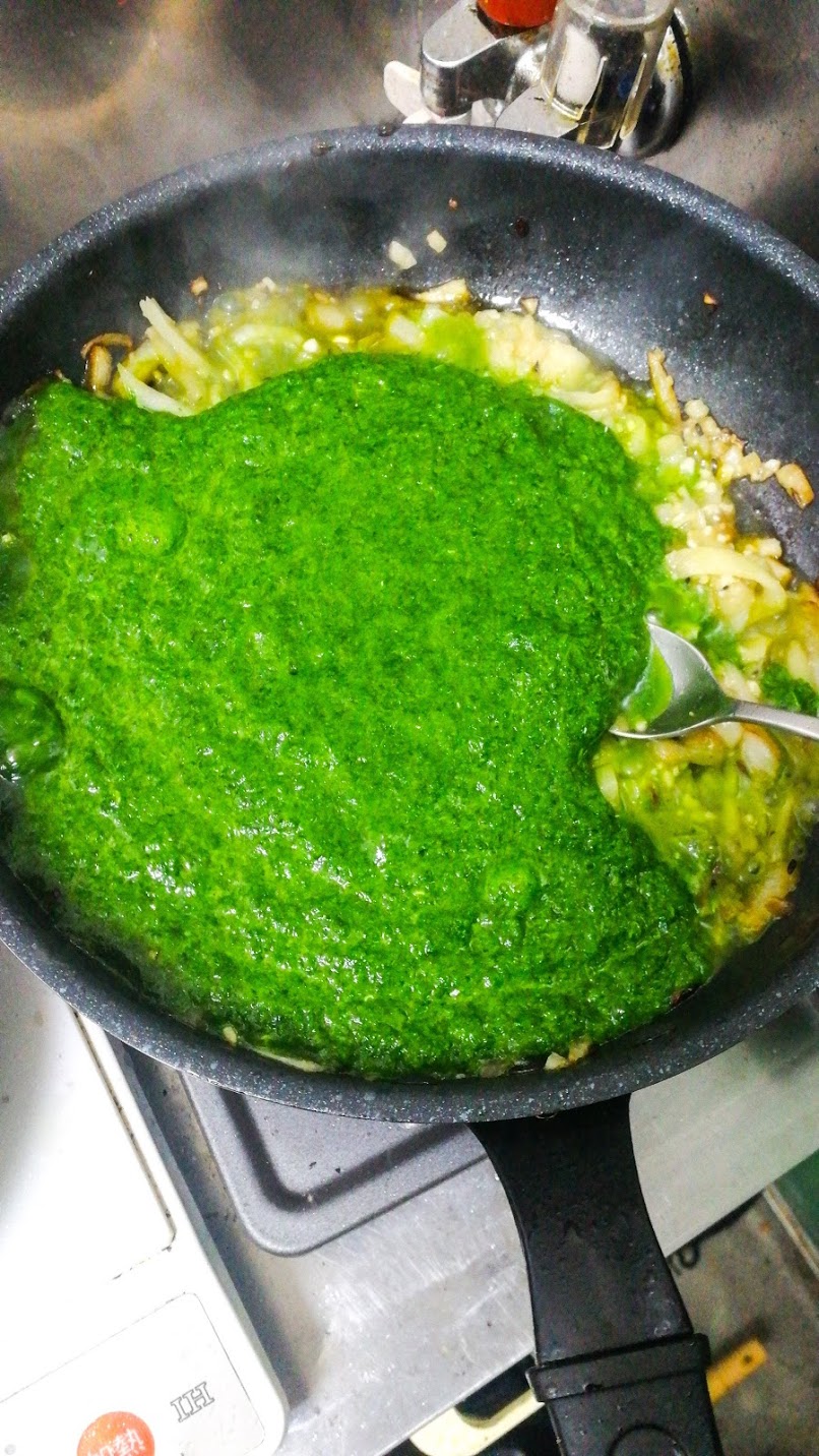 例えば、サグカレー(緑色野菜カレー)のメイキングですね。楽しそうでしょ(笑)