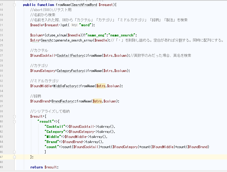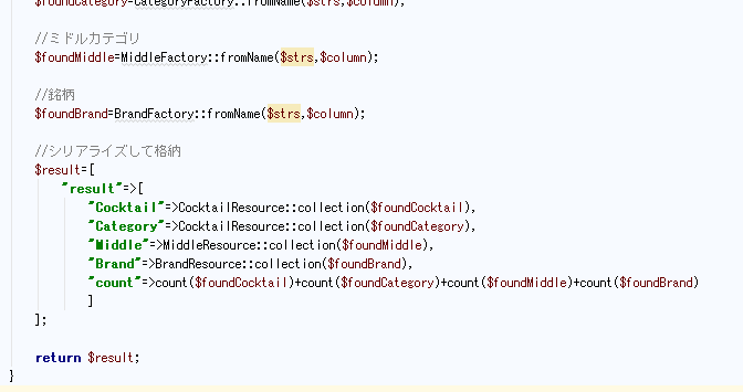 つまり、検索結果を表示させる母体となるコンポーネントの中に、カクテルの検索結果、カテゴリの検索結果・・・・・・といったように、それぞれでコンポーネントを分ける構成になりそうですね。