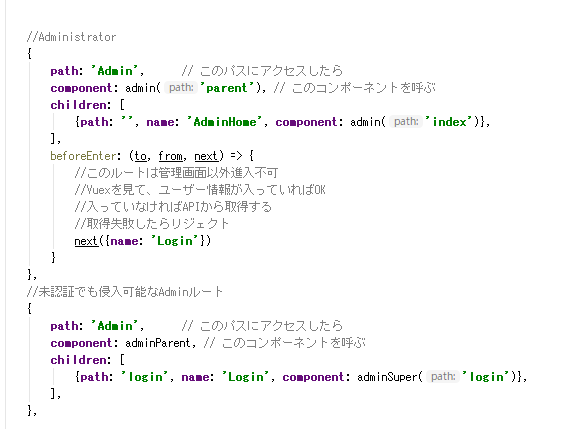 あとはログアウトした後、管理画面にアクセスしようとしたらログインページに飛ばされる、みたいな動作が確認できれば大丈夫でしょ。このへんはvue-routerで対応可能だと思います。要するにログイン状態は全部Vuexで管理して、情報もそこに流し込みます。ログアウトボタンが押されたらVuexの情報を削除して、ログアウトさせるようなルーティングに飛ばしていけばおけおけ丸だと予想。