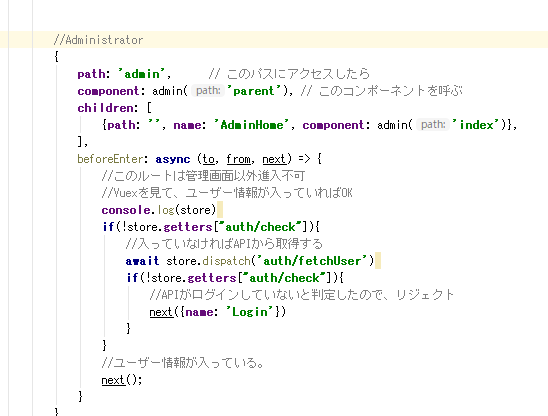 ここで、認証済ルートに到達した時点で、axiosでユーザーデータを取ってきます。ログイン時点でクッキーとかに埋め込んでいいのかも知れませんけど、いつまでも情報がクッキーに残るのはキモいしログイン時にVuexに格納したいわけですし、とりあえず手段としてはもうそれでいいかな感がしたのでとりあえず実装します。