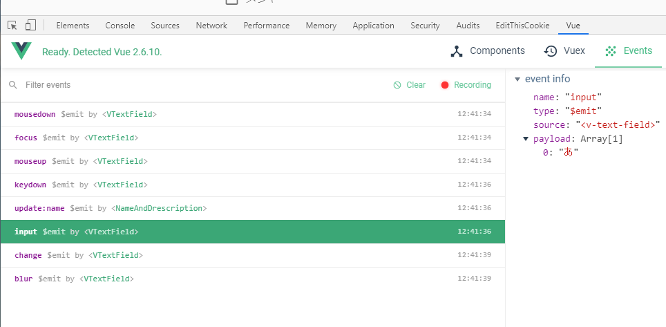 こういう画面あるんですけど、$eventでpayloadとして渡されてるのが、フォームに入力された文字列なんですよね。でもこれ、子コンポーネントが発火してるイベントじゃなくてVtextFieldが発火してるinputイベントなんですよ。