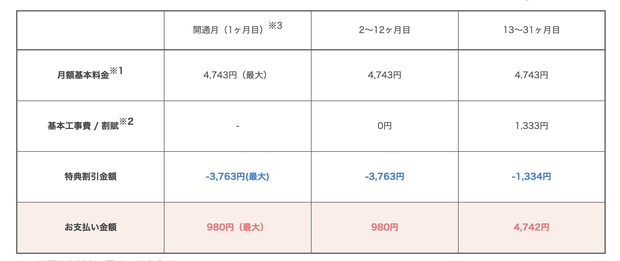 こちらが楽天ひかりの料金表ですね。補足として、利用料1年が無料になるみたいです。これはおいしいなあとは思いますが、その後の負担が結構大きい感じもしますね。
