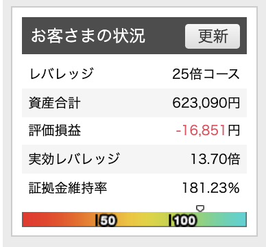 今の資金状況としてはこんな感じですね。一応口座に62万ありますが、このうち25万は追証回避用の資金・・・・・・つまり