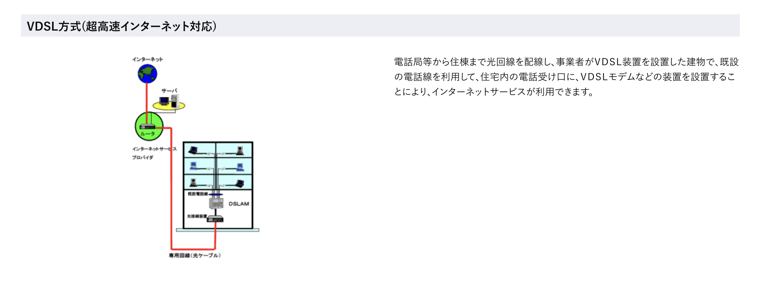 おそらくこういう仕組みなんですよね。住棟までは光回線で、各戸への配線が電話線なのでVDSL方式・・・・・・という説明になるんかな。