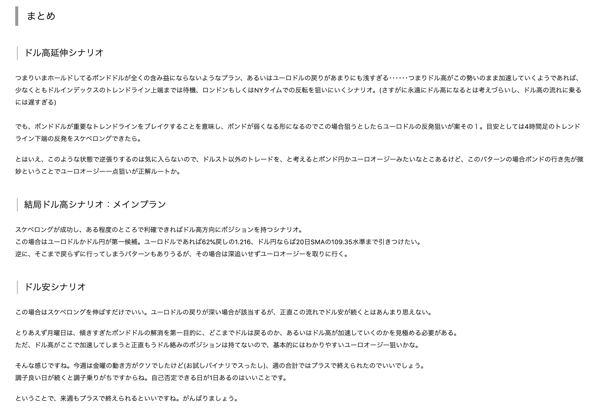 インジケーターの説明すらしてないのでまじで不親切コンテンツなんですけど(笑)、やっぱFXはじめた1年前とかと比べるとチャートの見方が分かってきてるというか、いろんなシナリオを想定できるようにはなってきてるんですよね。