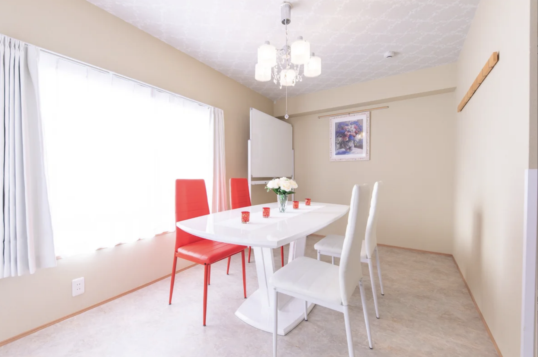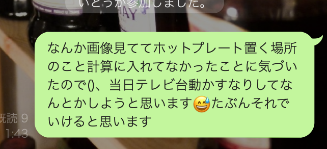 この空間に10人座れるやろっていう前提で予定立ててたんですよね。椅子の前に4人座って、その向かい側に4人座って、で、机の辺にそれぞれ1人ずつ・・・・・・。