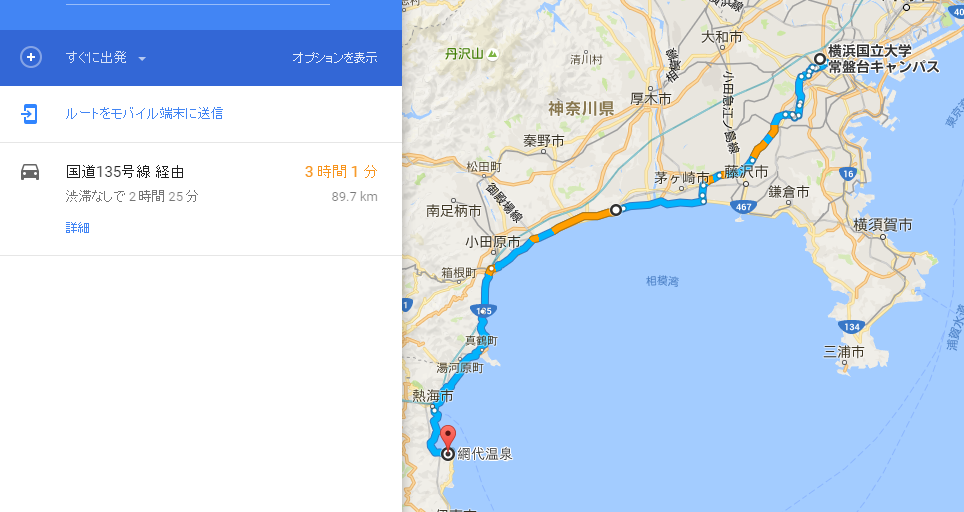 まぁ温泉入りたいですもんね。でも温泉旅館は高いのでNGです。金がないから野宿は確定事項です。 こんなルートでいきました。片道3時間かかるんですねー。