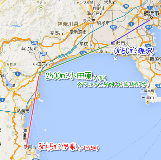 で、合計して約4時間弱あれば伊東に着くことができる、という算段です。