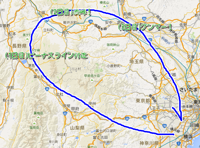もうあるいは3泊3日みたいなノリで行ったほうがいいかも知れませんね。夕方に出発して、山梨と長野の間ぐらいで1泊目で・・・・・・。もうそれだったら4泊でいいかな。(笑)