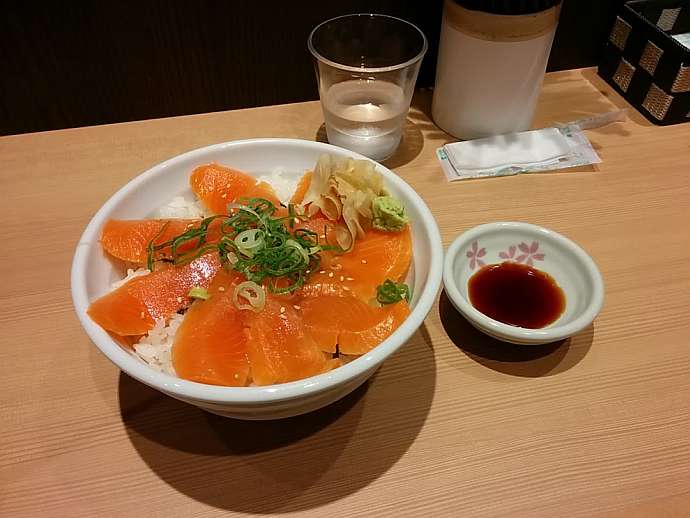 ただ、サーモンってもうちょっともっちりしてた記憶があるんだけどなぁー・・・・・・どうだっけなーとか思いながら食べてました。まぁ、美味しいことには美味しいんですけど、あまりにも久々にサーモン食べたので、サーモンが一体どんなものだったか忘れてしまったんですよ。ただ、とてつもなく食べたくなってしまって。(笑)