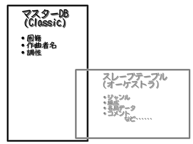 この構造で何がしたいかというと、例えばオケと室内楽のデータベースを2つ作りたいなぁと思った時、どう考えてもブラームスはどっちにも出現するので、親となるデータベースの中に格納してしまいましょうと。