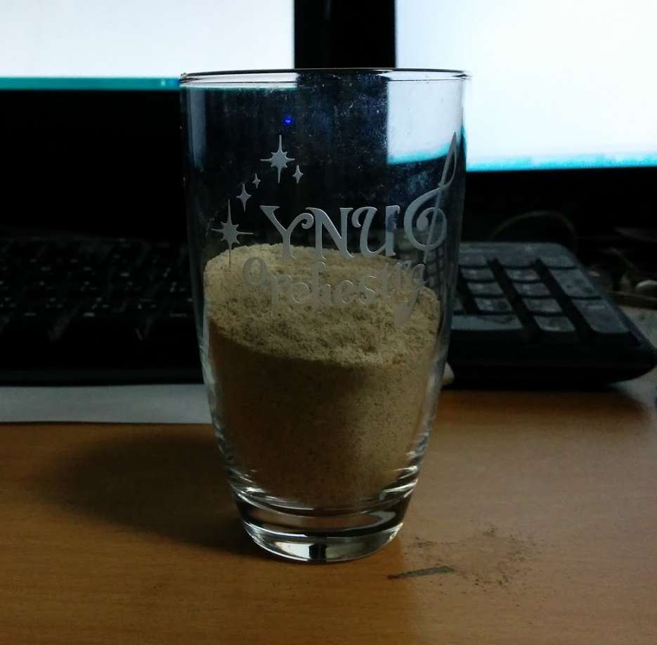 ちなみにプロテインはこんな感じです。本当はシェイカーに入れて飲むんですけど、買ってないのでコップで代用です。思ったより分量多くて失敗してますけど(笑)