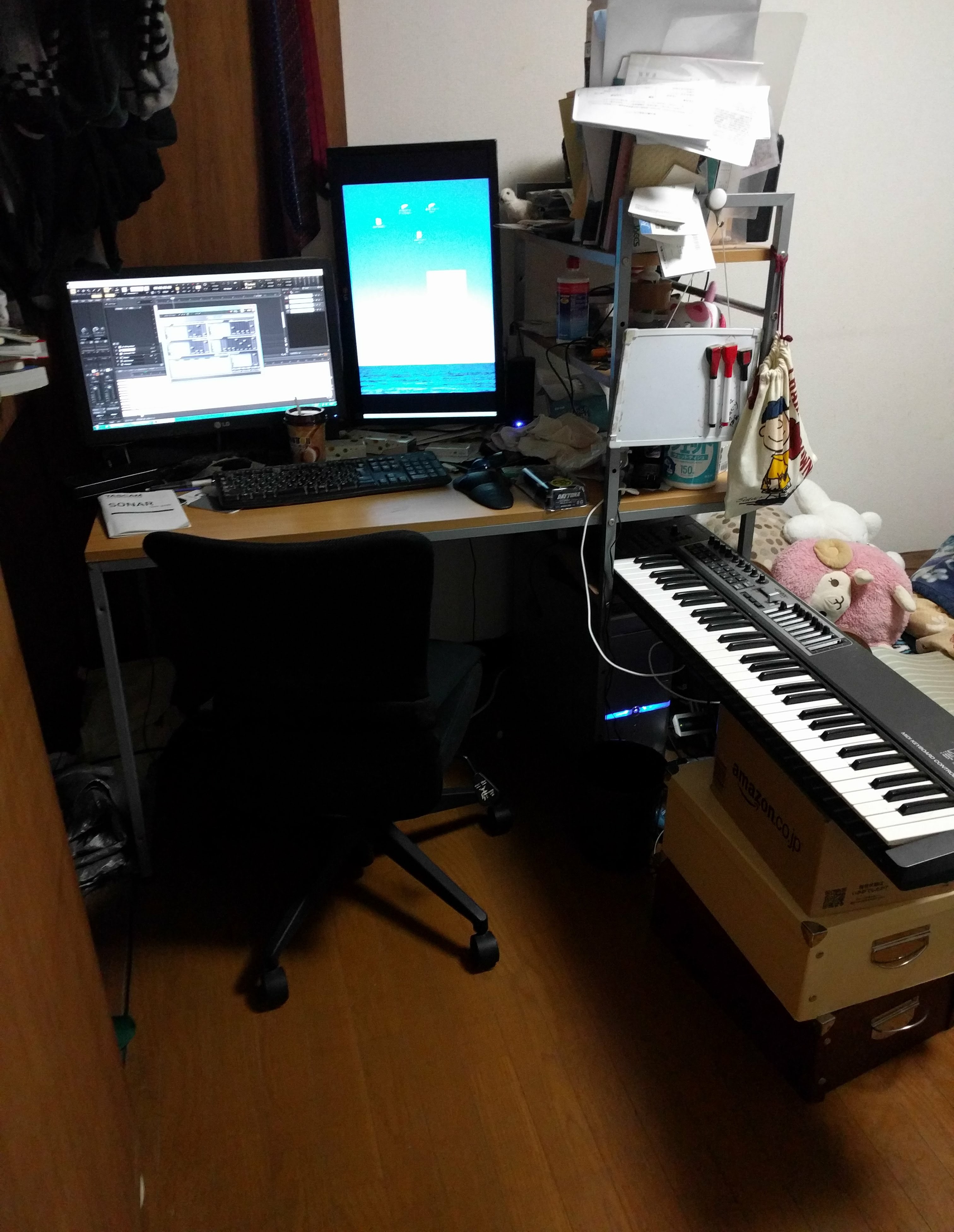 ありあわせで作ったものですが、これがなかなかいい感じにフィットしましてね。まぁ本格的にDAWを扱えるようになったら追加のデスクの購入も考えますが、まぁしばらくはこんな感じで。