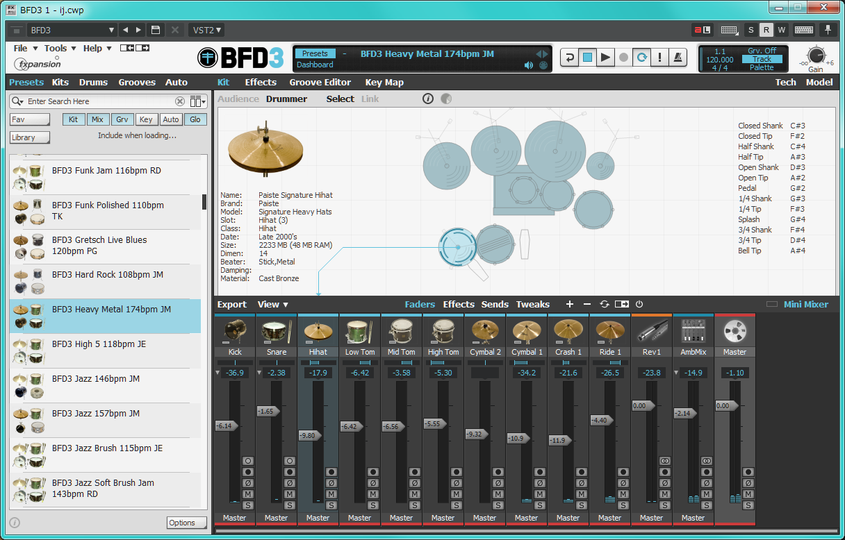 ざっと見た感じ主要な音に関しては統一されているっぽいのですが、プリセットによってはこんな風に一つのハイハットに10個ぐらい叩き方のバリエーションが設定されてたりするので厄介ですね。