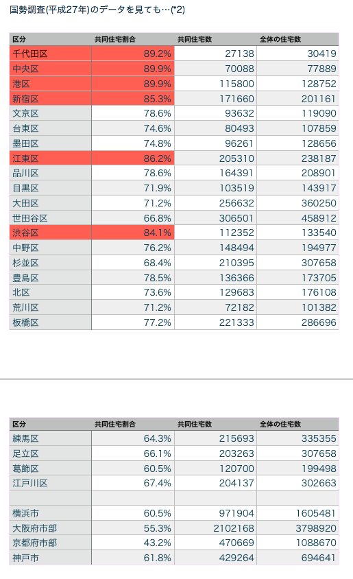 最新の国勢調査のデータを集めて、共同住宅・・・・・・つまり、マンションやアパート等、の都心における割合を出してみたりしました。