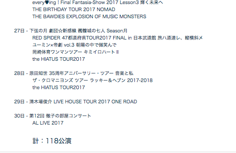 あと、こんなデータを集めたりしてみました。11月に「東京都」「神奈川県」で開かれる、比較的規模の大きいライブの一覧ですね。チケットが多く売りに出されてるやつを抽出しました。