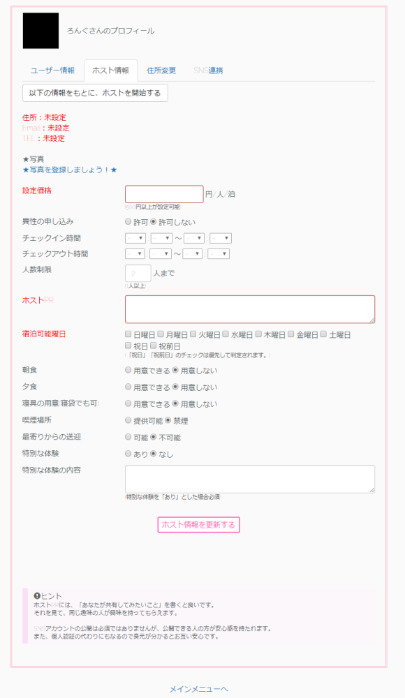実は未だにプロフィール画面の制作で作業が止まっていて、今はこのホスト画面の完成が待たれています。