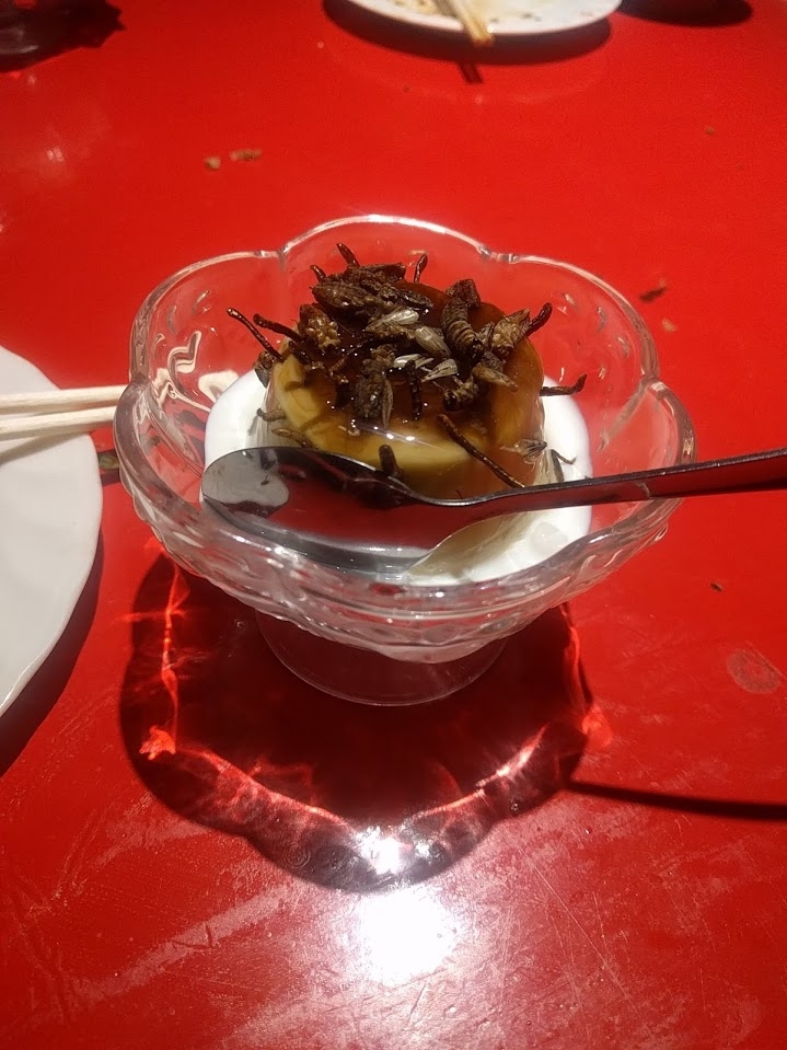 意外と美味いんですよ・・・・・・。いやほんと・・・・・・。上に乗ってる虫は一体何なのかわかりませんが、チョコの味がほんのりしました。