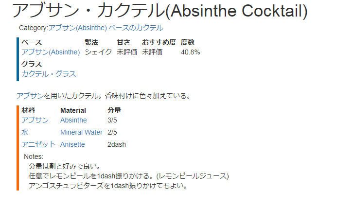 このレシピを素直に読み解くと、アブサンと水を加えてアニゼットを加えるレシピだなぁってのは分かりますね。で、補足で分量は割と好みでいい、というのを付け足しています。