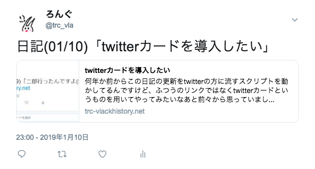 rawText()ってのがtwitterカードに必要なタグを生成している場所で、これがあることで2019年1月以降の日記にリンクを貼ると、twitterカードが表示されるようになります。