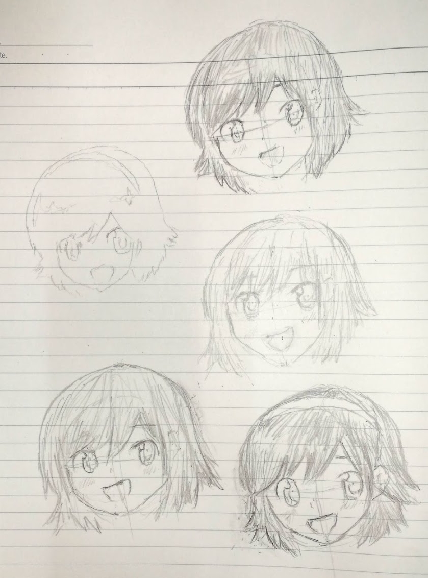 じっくり見て思うことは・・・・・・そうだなあ、一番右下の絵とか、目のパーツそれぞれは悪くないんですけど高さとか形が一致してないから変な感じに見えるんですよね。なんで、アタリを描く際に補助線を引いた方がいいのかもしれない・・・・・・。