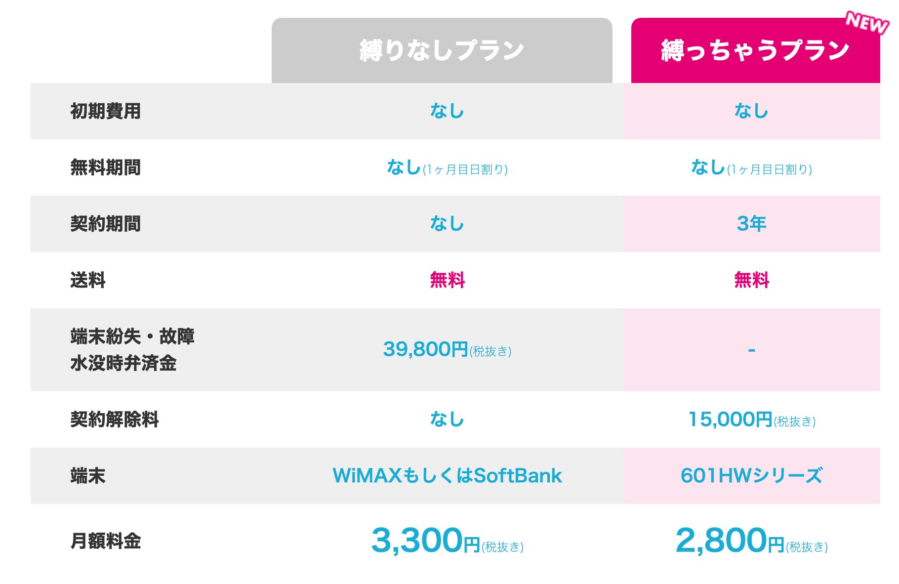 これどういうサービスなのかっていうと、その名の通り縛りのないサービスで、月額料金が3300円で固定なんですよね。3年目以降月額料金が跳ね上がって4000円になる^^とかいう悪質プロバイダあるあるじゃないのが好印象ですね。