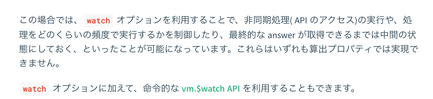 算出プロパティ(computed)を使って実装すべきとのことなんですが、この前書いたコードではウォッチャを採用してますね。
