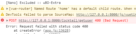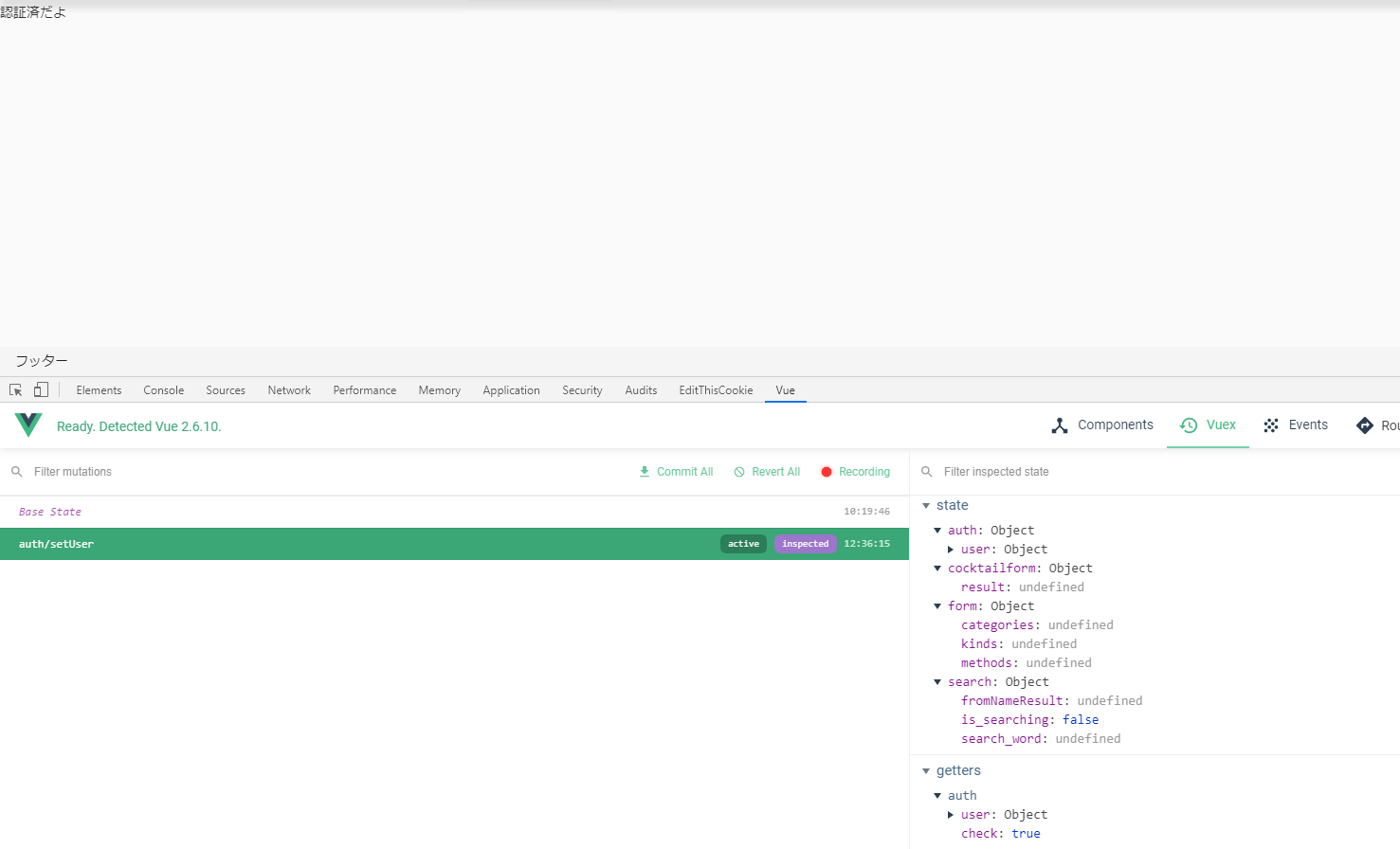 ここで、認証済ルートに到達した時点で、axiosでユーザーデータを取ってきます。ログイン時点でクッキーとかに埋め込んでいいのかも知れませんけど、いつまでも情報がクッキーに残るのはキモいしログイン時にVuexに格納したいわけですし、とりあえず手段としてはもうそれでいいかな感がしたのでとりあえず実装します。