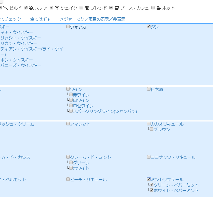 例えば、このようにジンとミントリキュールを選択するじゃないですか。すると、ドライジンがメジャーカテゴリに入ってないので