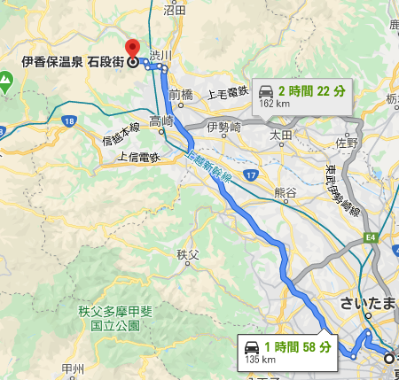 伊香保に直に行くことを仮定するとこんな感じになりますね。はっやいなあ・・・・・・。ちなみに板橋起点なのは彼女がその辺に住んでるからです。