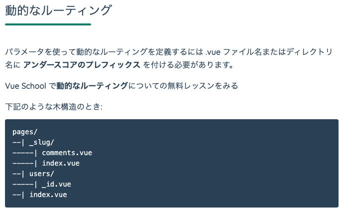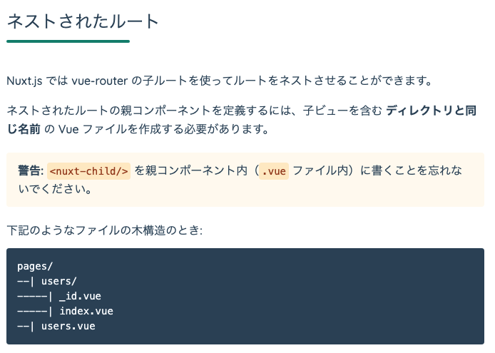 ネストされたルート、これがちょっとめんどくさそうですね。たとえばusersというディレクトリを使いたかったら、users.vueを作れ、ってことらしい。ちょっとこれはディレクトリ構造が煩雑になりそうなにおいはします・・・・・・。まあ仕方ないのかな・・・・・・。