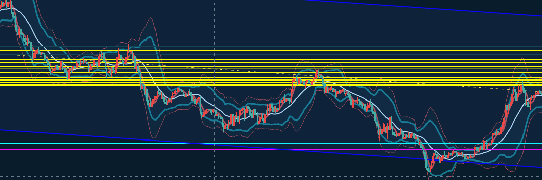 意識されてそうなライン全部に水平線を引いておくことにしました。これが基本的な利確ラインになります。黄色い線がそれに該当します。
