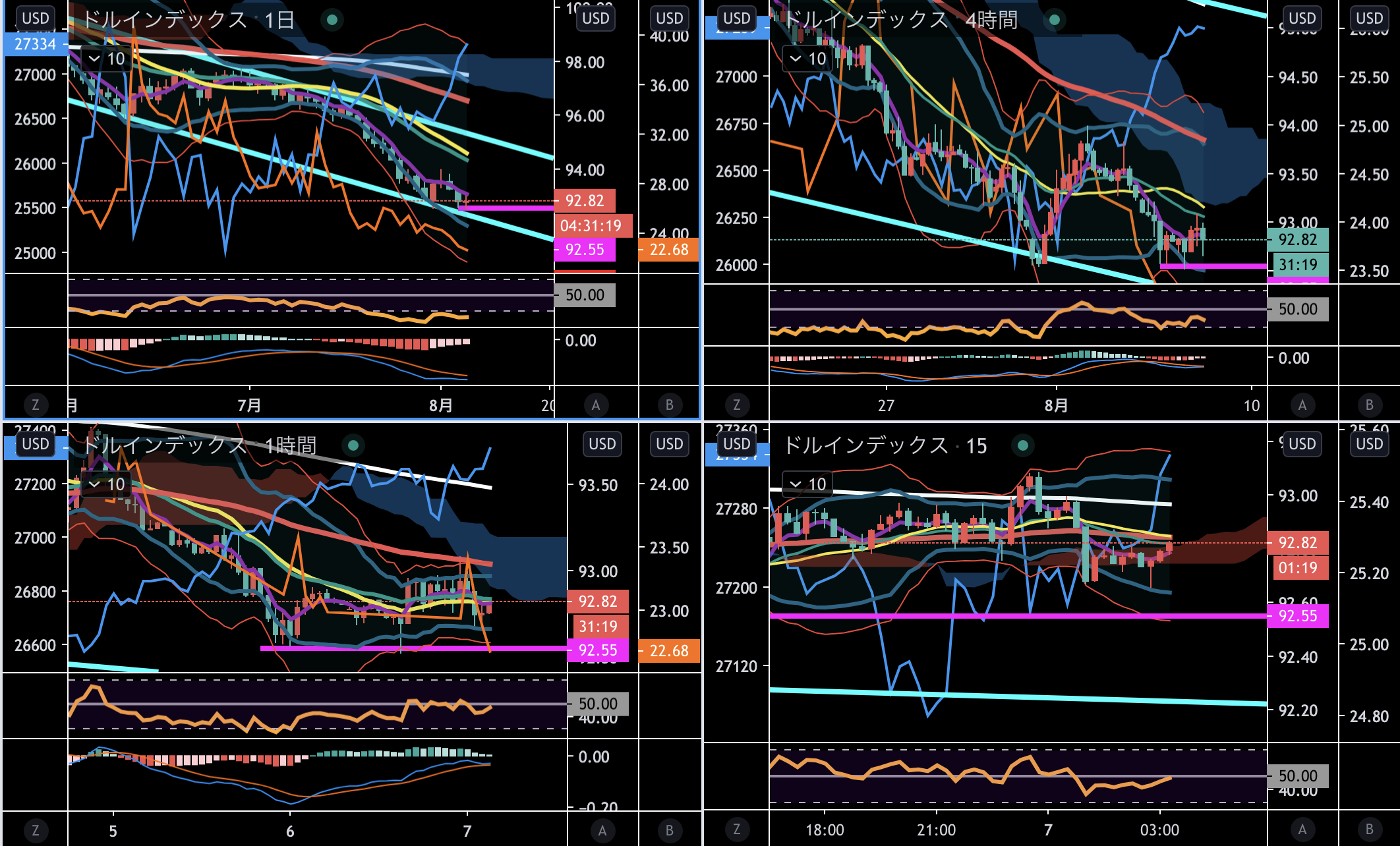 で、いまのドルインデックスはこんな感じなんですが、ちょっとわからない感じですね・・・・・・。一旦抑えられてはいるのですが、このまま下降するのかこのままレンジになるのか・・・・・・って感じはします。レンジになる前提であればドルの影響はある程度無視して、テクニカル的に攻めるという考えもできますし、逆にドルインデックスが反発やトレンドの兆しを見せているのであればそれを参考にしたトレードはすべきだと思います。