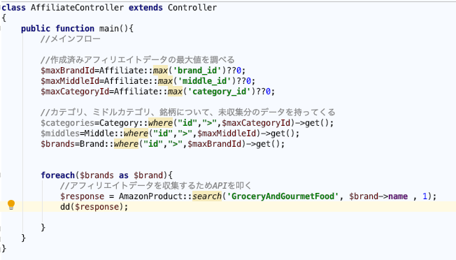 まずはbrand_idの最大値を検索し、それよりも大きなbrand_idがbrandテーブルに存在するのであれば、そのデータはまだアフィリエイト情報が作成されていないのでデータを作成する必要がある・・・・・・という流れができますね。