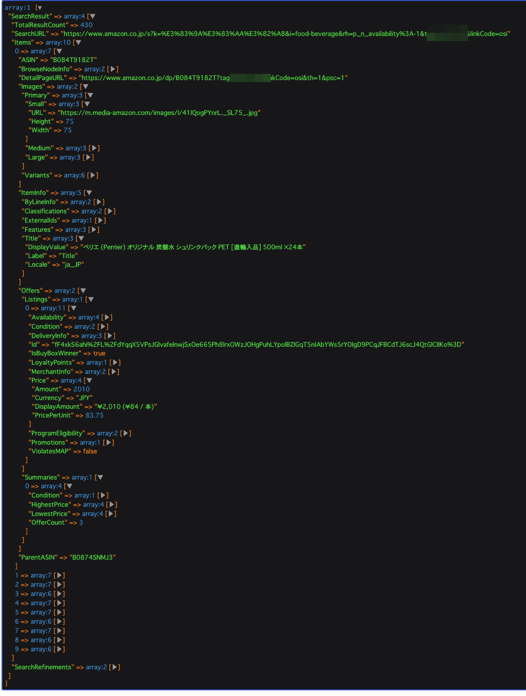 わかりづらいと思いますが、この状態だとこういうデータが返ってきます。要するにオプション全指定したものが返ってくるっぽいですね。こんなにいっぱいデータ要らないんですけど、必要なものは揃ってるので、ここから必要なものを抜き出すことになります。